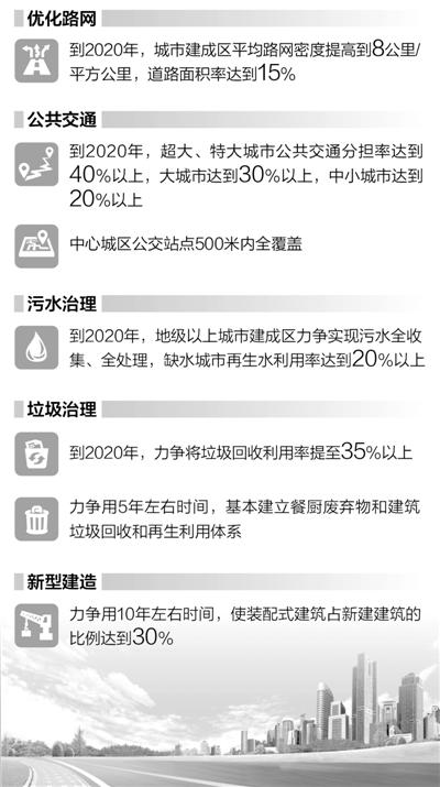 比如,在大力推进棚改安居方面提出,到2020年,基本完成现有的城镇棚户区、城中村和危房改造;在优化街区路网结构方面提出,到2020年,城市建成区平均路网密度提高到8公里/平方公里,道路面积率达到15%;在推进污水大气治理方面提出,到2020年,地级以上城市建成区力争实现污水全收集、全处理,缺水城市再生水利用率达到20%以上;在加强垃圾综合治理方面提出,到2020年,力争将垃圾回收利用率提高到35%以上……