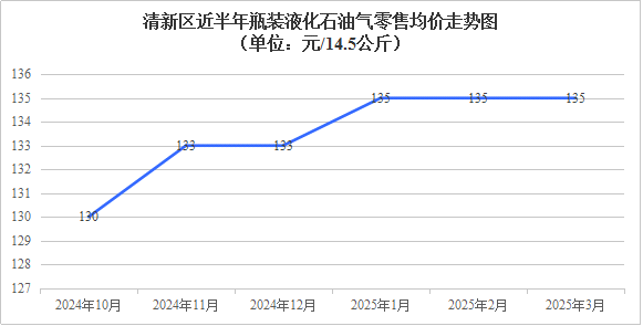 3月份,清新区液化石油气供应充足,价格稳定,瓶装液化石油气(14.5公斤,不含送气费)零售均价135元,与上月价格持平。