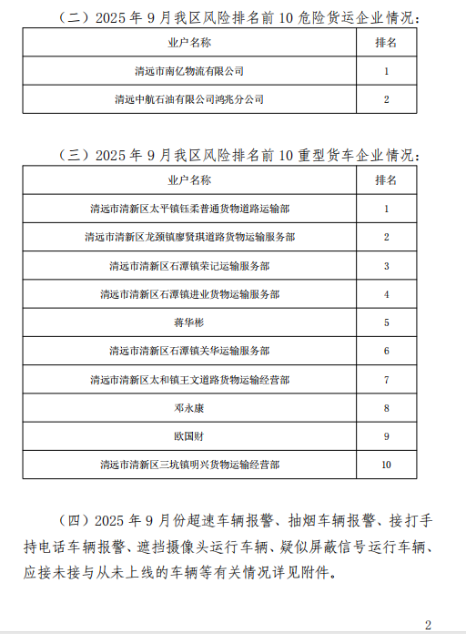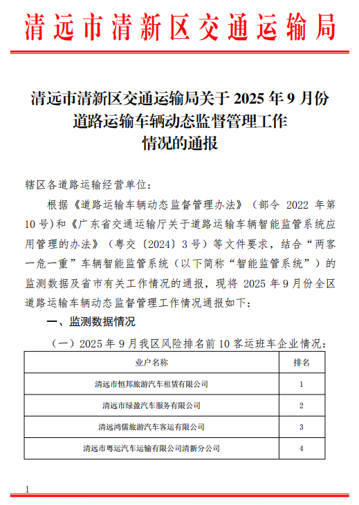 清远市清新区交通运输局关于2025年9月份道路运输车辆动态监督管理工作情况的通报