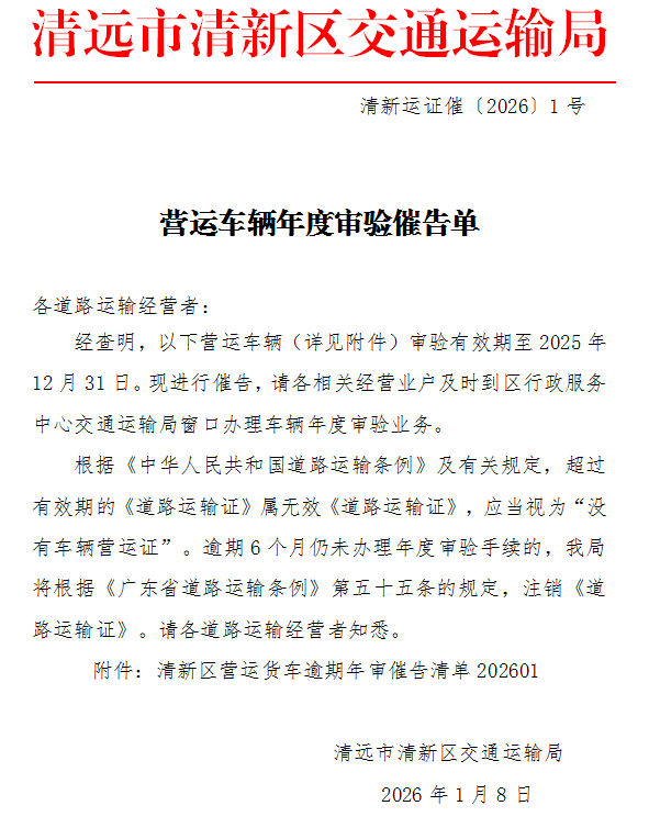 营运车辆年度审验催告单[清新运证催〔2026〕1号]