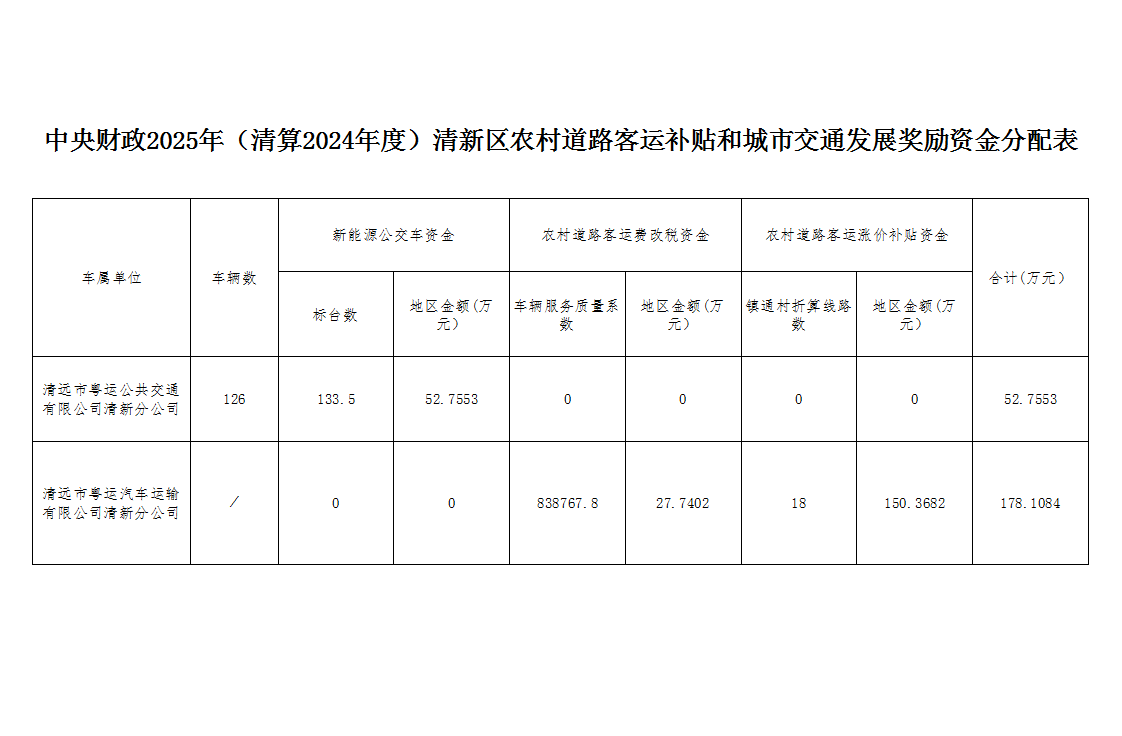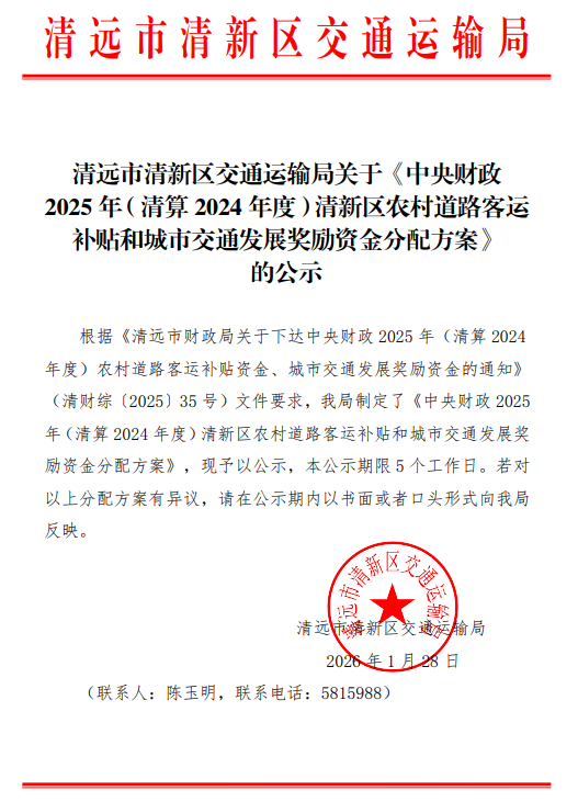 清远市清新区交通运输局关于《中央财政2025 年(清算 2024 年度)清新区农村道路客运补贴和城市交通发展奖励资金分配方案》的公示