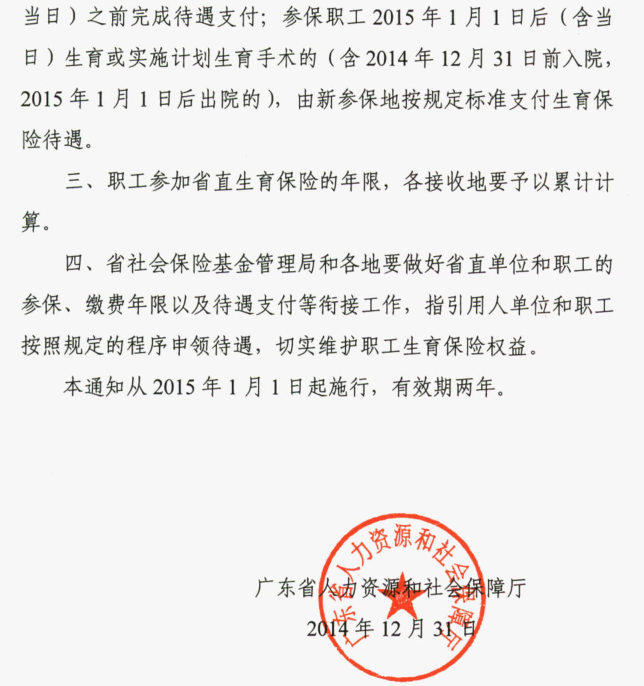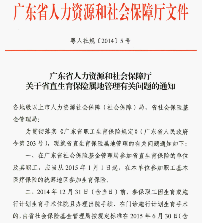 广东省人力资源和社会保障厅关于省直生育保险属地管理有关问题的通知(粤人社规[2014]5号)
