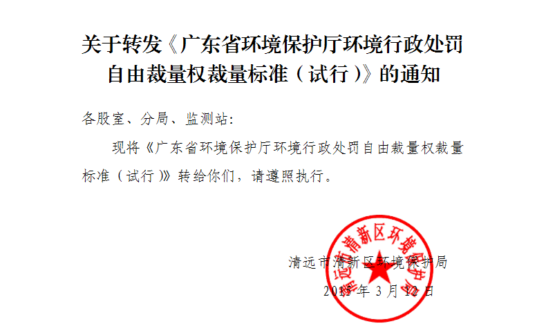 关于转发《广东省环境保护厅环境行政处罚自由裁量权裁量标准(试行)》的通知