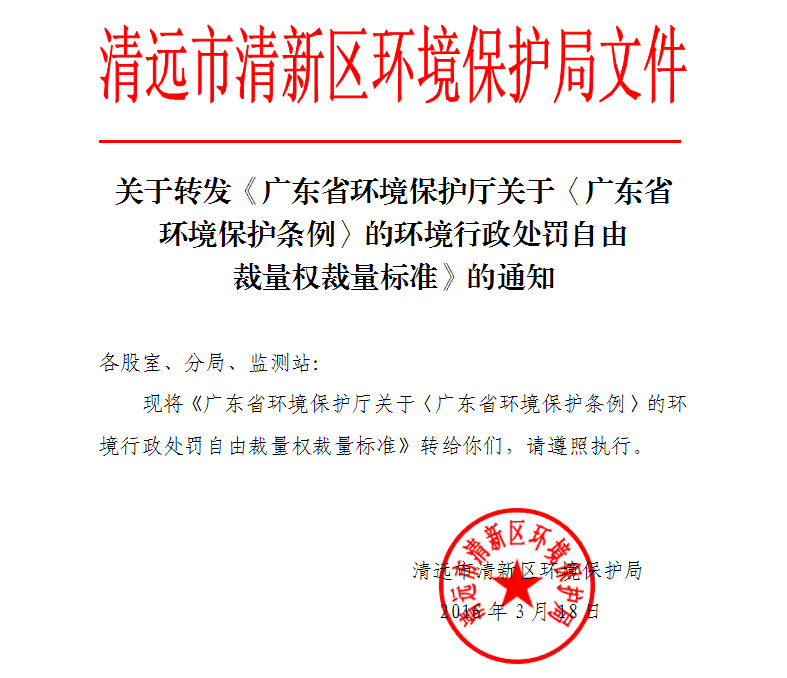 关于转发《广东省环境保护厅关于〈广东省环境保护条例〉的环境行政处罚自由裁量权裁量标准》的通知