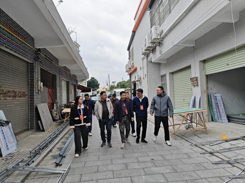 随后,代表们前往圩镇骑楼街片区,视察外立面提升工程进展。为系统提升山塘整体风貌,形成连片示范效应,山塘镇谋划推动了B小区改造项目,重点打造骑楼街连片房屋外立面提升样板,共涉及65间房屋。工程建设内容包括对沿街建筑的窗户、墙面、屋顶、广告招牌、空调外机等要素进行统一规整与风貌提升,其中住宅建筑墙面采用真石漆面层工艺进行改造,以提升整体质感和耐久性。该工程旨在以“面的示范”带动“全镇改善”,是提升圩镇形象、改善人居环境的重点举措。代表们沿街查看,对改造后的整体效果、施工工艺细节及与原有风貌的协调性进行了现场评议,并就如何建立长效管护机制、调动居民参与积极性等方面进行了交流探讨。