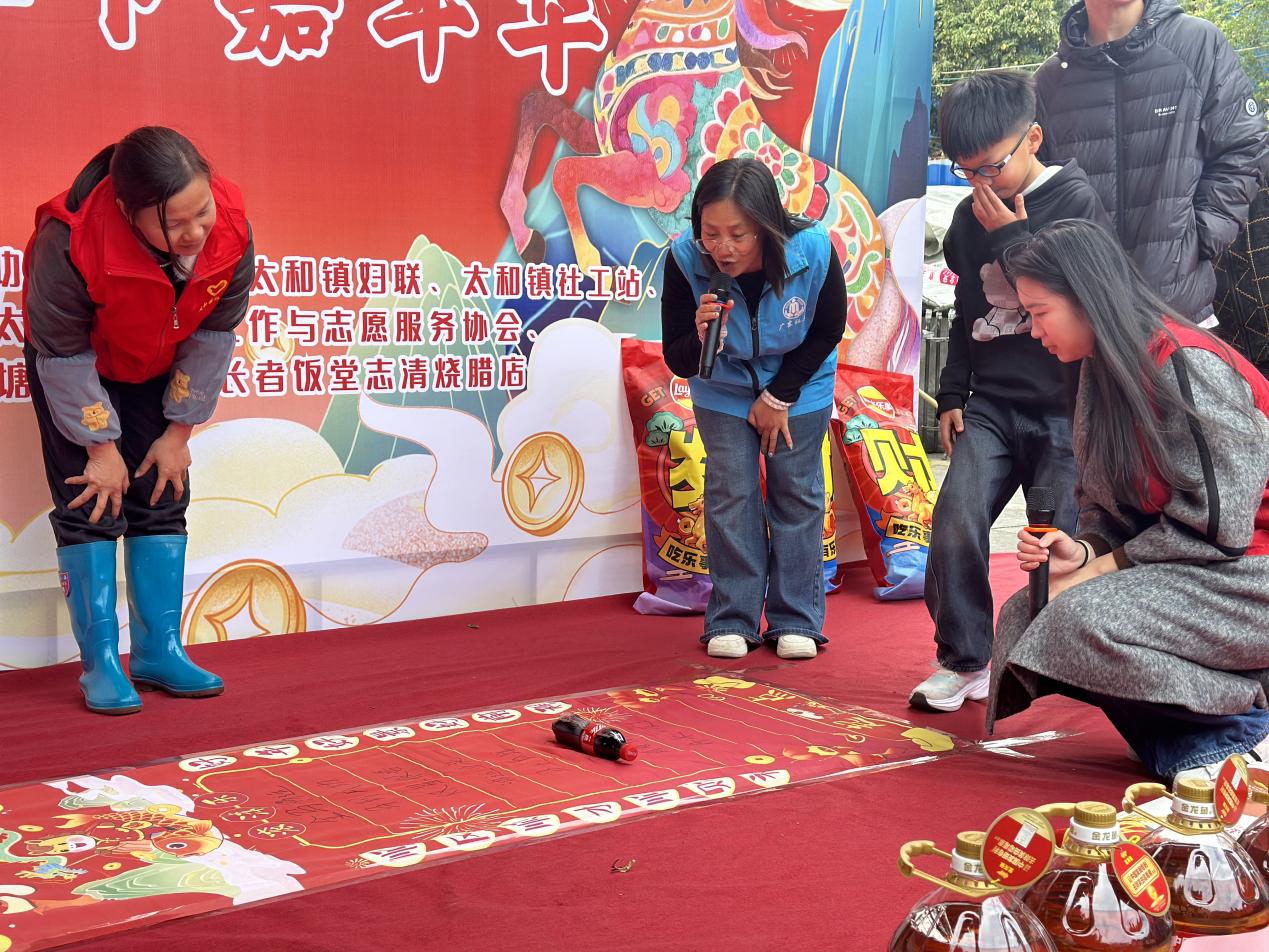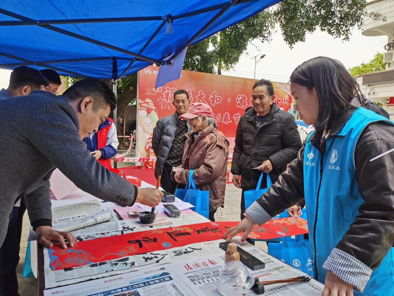 “健康加油站”里,太和镇卫生院医护团队为长者提供血压、血糖检测等义诊服务,普及健康知识,把便捷医疗送到家门口,切实守护老年群体健康;“安全守护站”通过趣味问答,向家长与孩子宣讲交通安全、消防安全、寒假安全知识,提升家庭安全防护意识;“一马当先”游戏区热闹非凡,村民们扇动小马趣味闯关,在互动中收获欢乐与奖品;“福联迎春”摊位墨香四溢,书法志愿者现场书写福字、春联,免费赠予村民,传递新春祝福与传统年味;“长者饭堂·新春尝鲜”摊位同步宣传长者福利政策,让惠民服务触手可及。