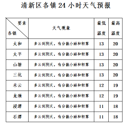 【清新天气预报】预计今晚到明天,多云到阴天,有分散小雨和轻雾,13到20℃,偏北风1到2级,相对湿度60%到90%;12日,多云间晴,14到25℃;13日,晴到多云,15到26℃。清新区气象台2月10日15时发布