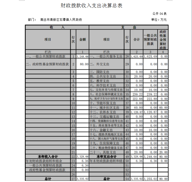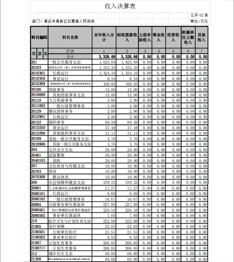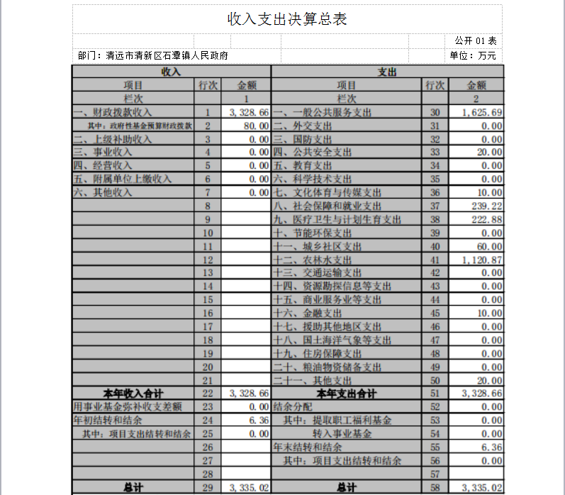 清远市清新区石潭镇人民政府2016年度总收入3335.02万元,其中本年收入3328.66万元。具体情况如下: