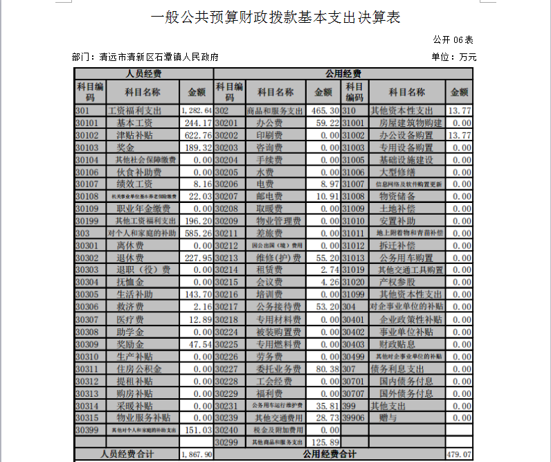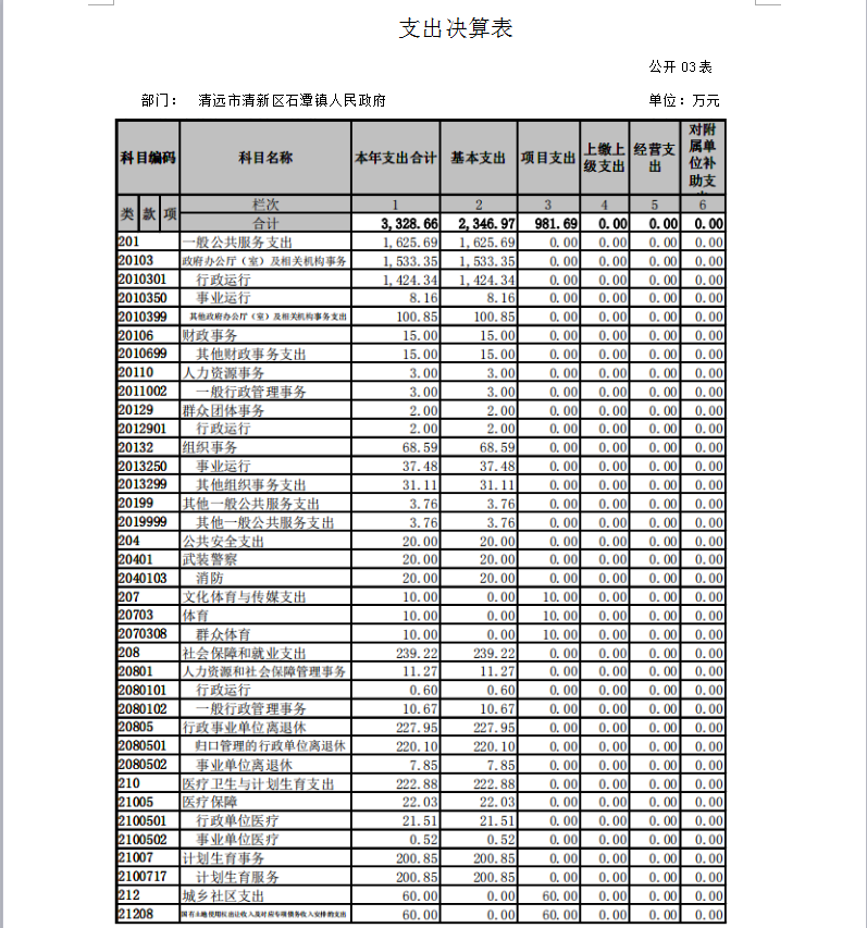 清远市清新区石潭镇人民政府2016年度总支出3335.02万元,其中本年支出3328.66万元。具体情况如下: