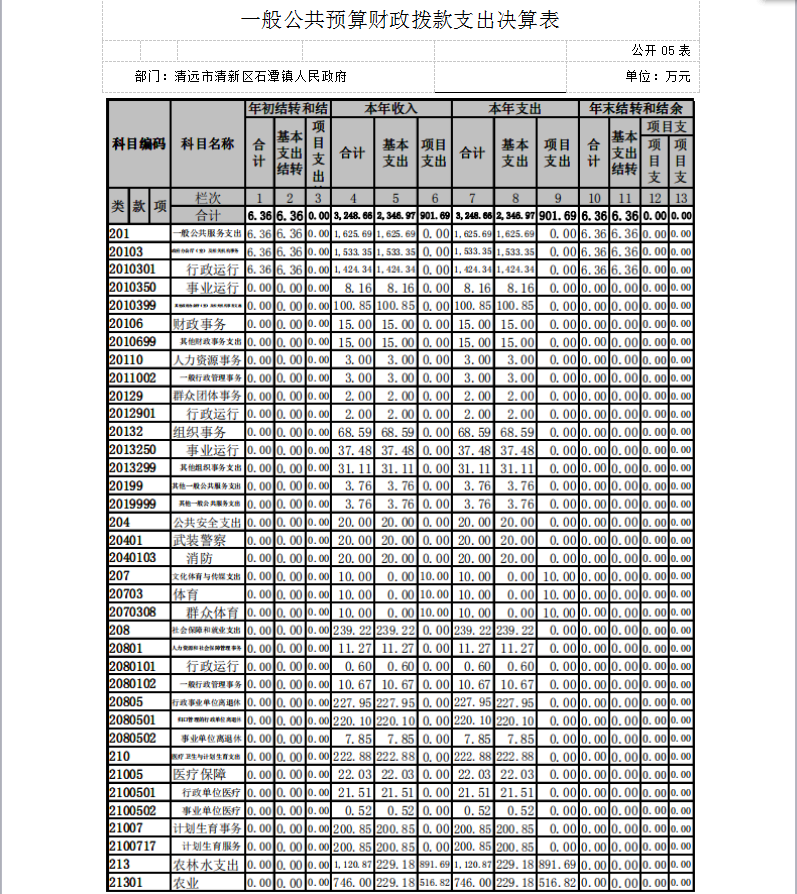 清远市清新区石潭镇人民政府2016年度财政拨款支出合计 3,328.66万元。其中:一般公共预算财政拨款支出3,248.66万元,比年初预算数增加968.23万元,增长42.46%;主要原因是一般公共服务支出增多,农林水支出增多。