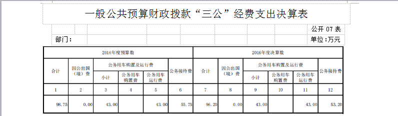十二、“三公”经费:按照党中央、国务院有关文件及部门预算管理有关规定,“三公”经费包括因公出国(境)费、公务用车购置及运行费和公务接待费。(1)因公出国(境)费,指单位工作人员公务出国(境)的住宿费、旅费、伙食补助费、杂费、培训费等支出。(2)公务用车购置及运行费,指单位公务用车购置费及租用费、燃料费、维修费、过路过桥费、保险费、安全奖励费用等支出。公务用车指用于履行公务的机动车辆,包括领导干部专车、一般公务用车和执法执勤用车。(3)公务接待费,指单位按规定开支的各类公务接待(含外宾接待)支出。