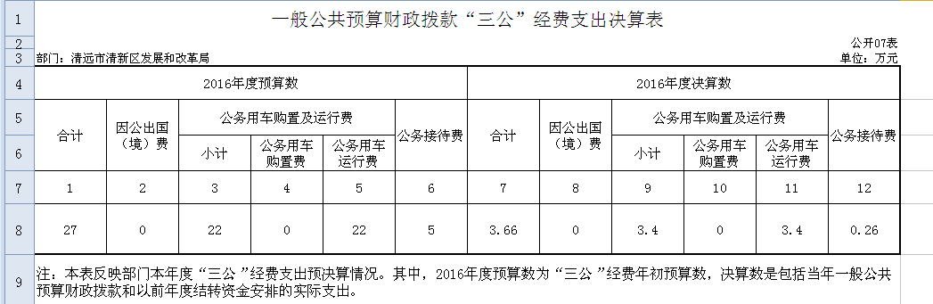 发改局2016年度“三公”经费支出预算为 28 万元,支出决算3.66 万元,完成预算的 13.07 %,其中:因公出国(境)费支出 0 万元,年初无预算;公务用车购置及运行费支出决算 3.4 万元,完成预算的 12.14 %;公务接待费0.26 万元,完成预算的 0.93 %。