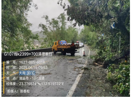 受今年第1号台风“蝴蝶”影响,6月13日至14日清新区遭遇强降雨及大风天气,107国道等多条主干道出现树木倒伏、断枝堆积等险情,部分路段交通中断。区交通运输局立即启动防御响应,统筹调配15辆养护作业车、80余名应急人员,交警、养护道班联合成立专项清障小组,对G107线、G355线、S354线、S383线等7条清新区国省干线公路开展“全覆盖式”抢险作业。