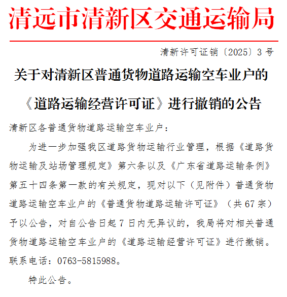 关于对清新区普通货物道路运输空车业户的《道路运输经营许可证》进行撤销的公告(清新许可证销〔2025〕3号)