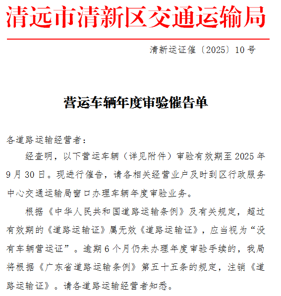 营运车辆年度审验催告单(清新运证催〔2025〕10号)