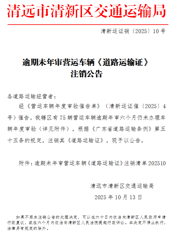 逾期未年审营运车辆《道路运输证》注销公告(清新运证销〔2025〕10号)