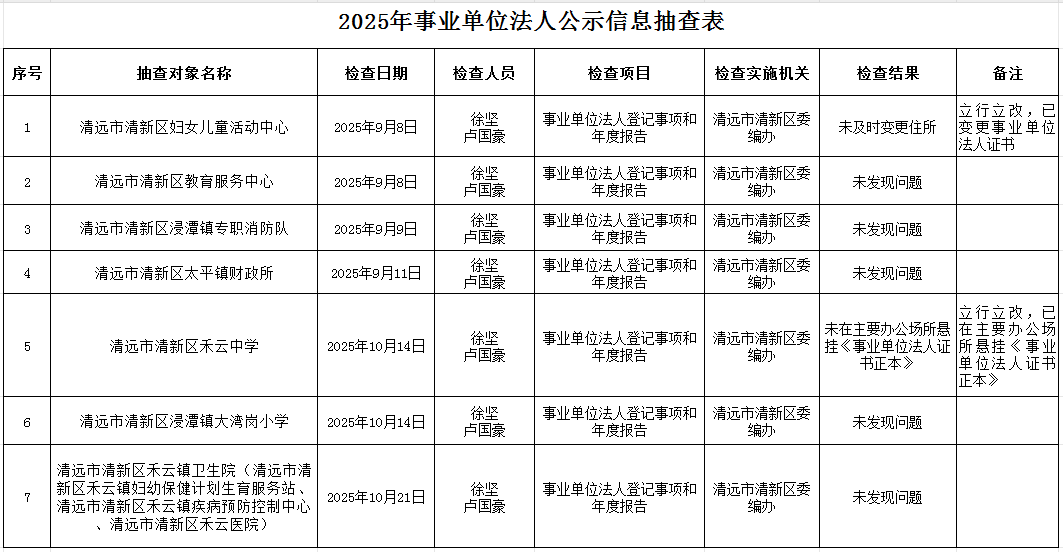2025年,清远市清新区事业单位登记管理局通过“双随机、一公开”方式,随机抽取检查对象和检查人员,实地核查检查对象登记信息、年度报告等公示信息情况,现将有关情况公示如下: